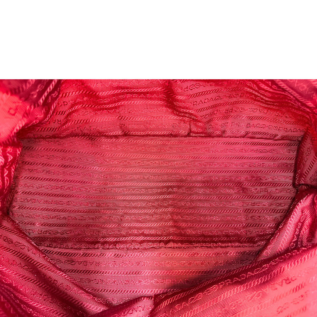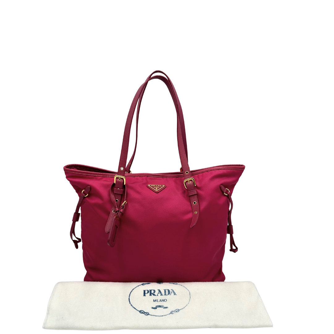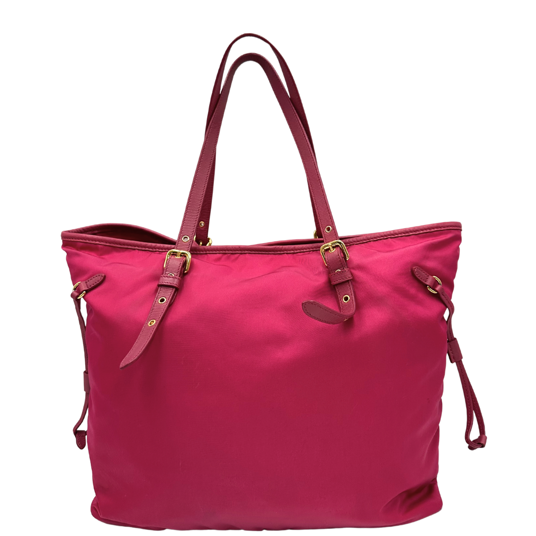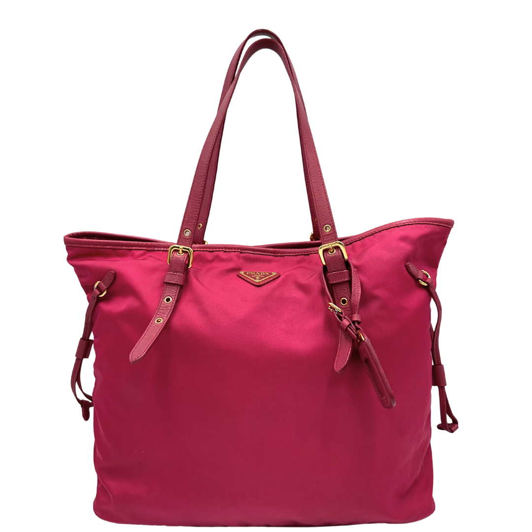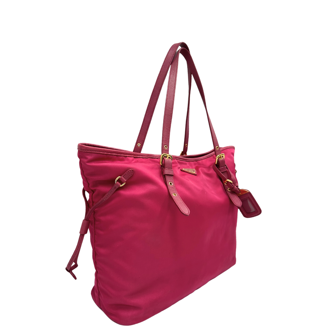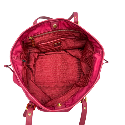 Descrizione: Shopper Prada in nylon fucsia con finiture in pelle saffiano tono su tono e parti metalliche dorate; da indossare a spalla. Completa di dustbag