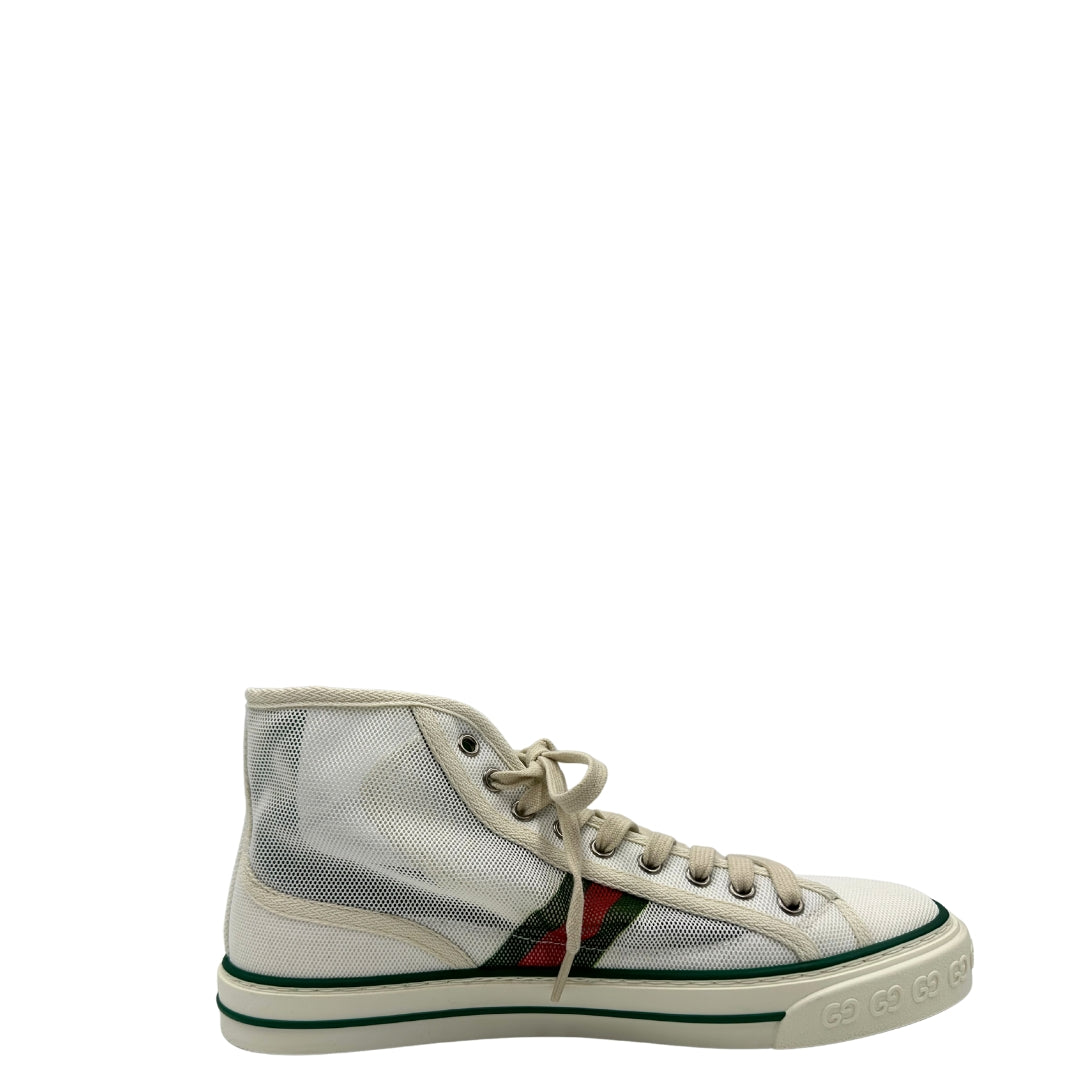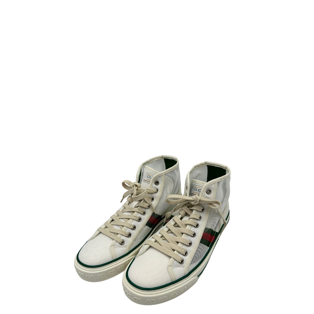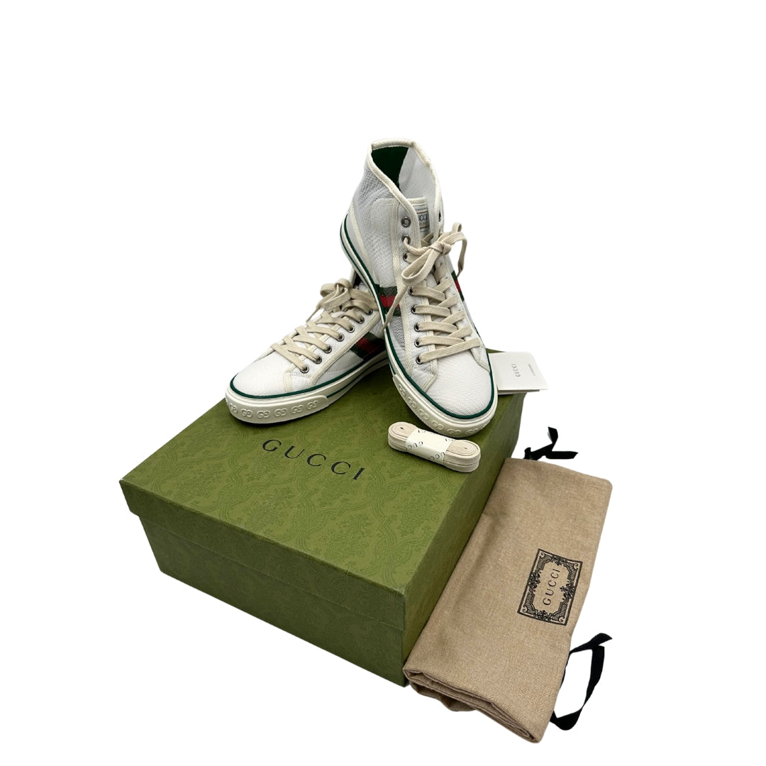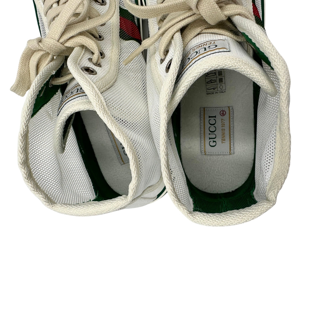 Descrizione: Sneakers alte Gucci in tela traforata bianca, con classica banda Web verde e rossa sui lati, suola in gomma decorata con motivo GG in rilievo e dettagli in verde sul bordo. Complete di corredo.