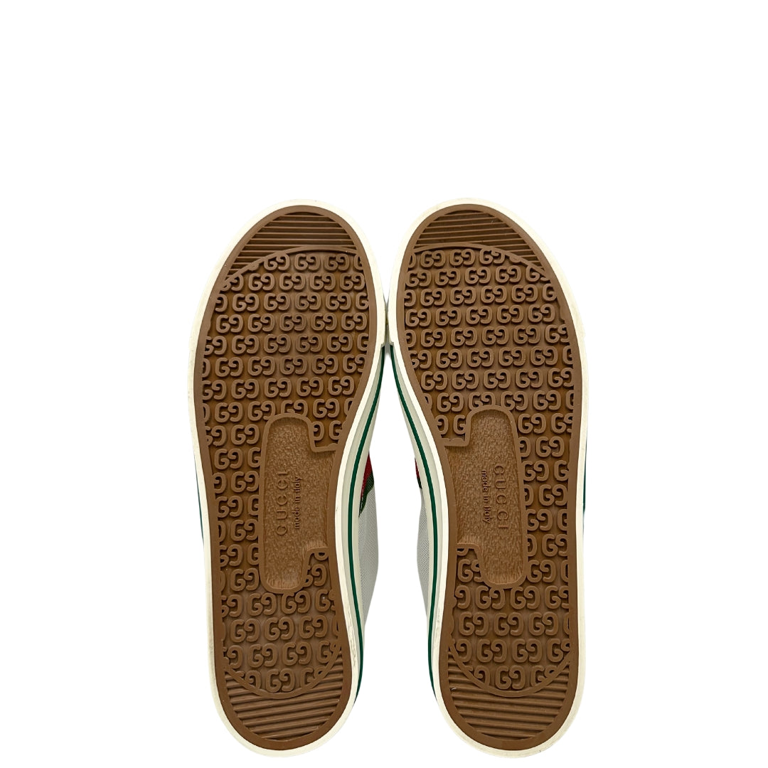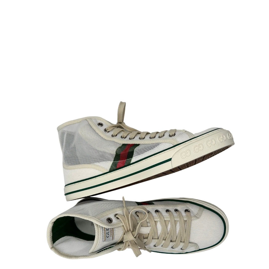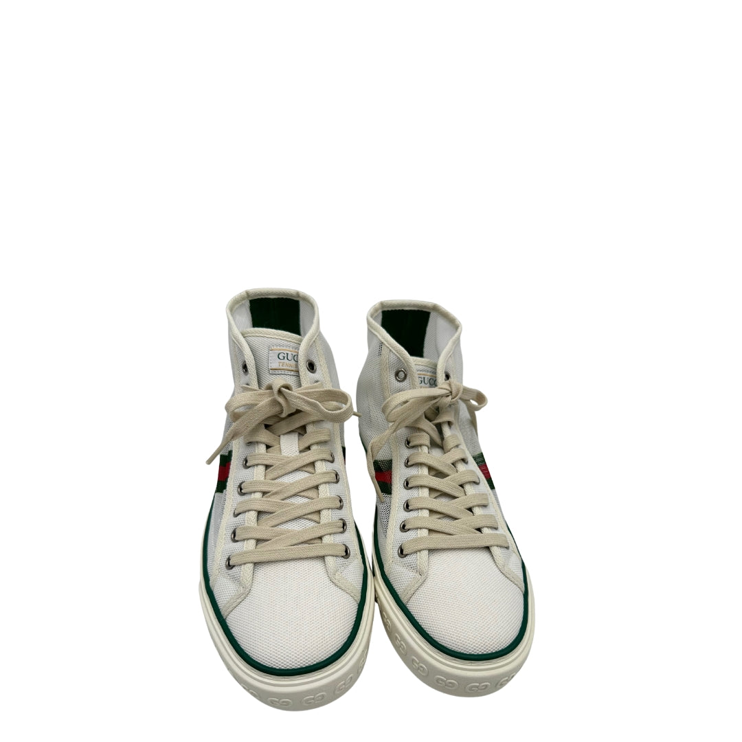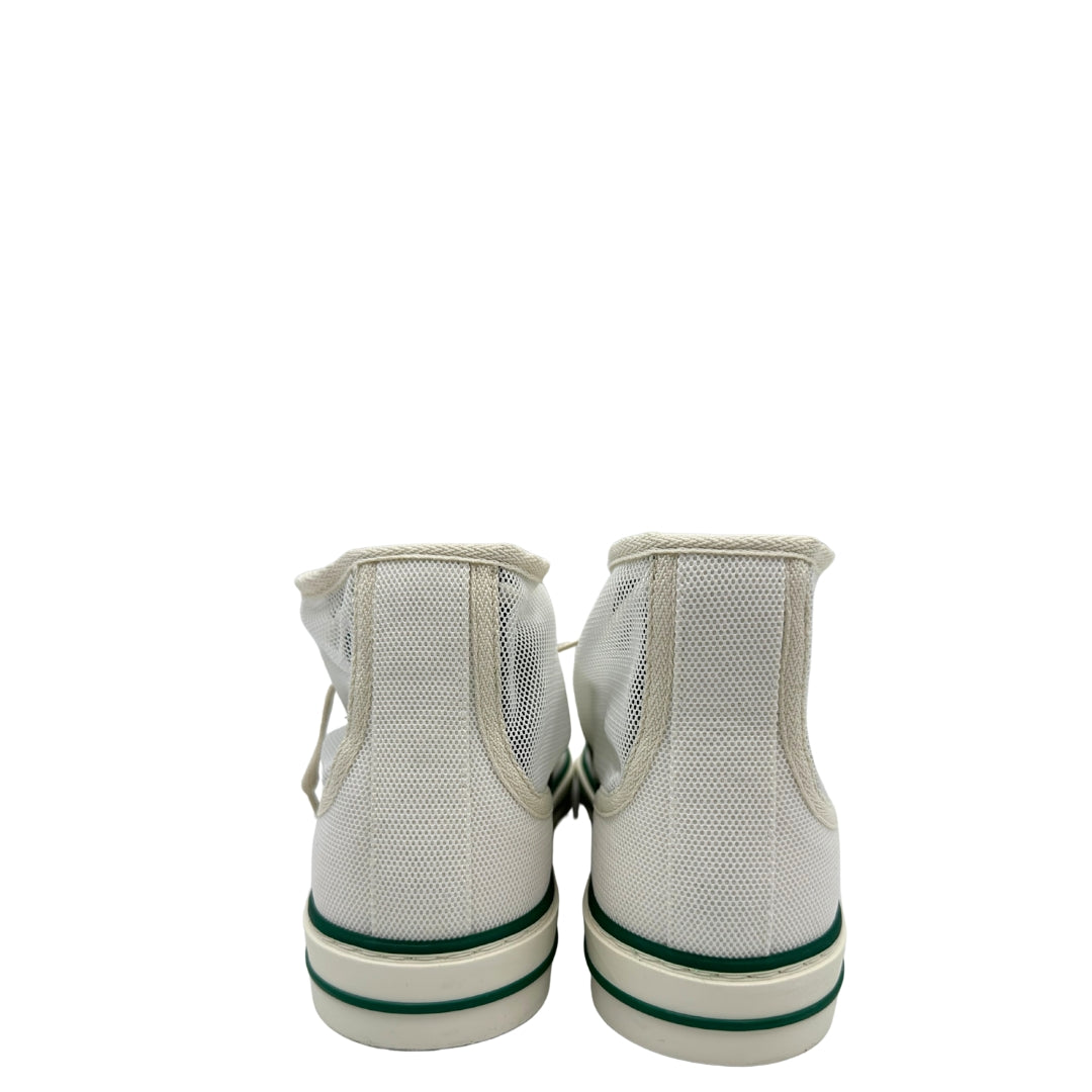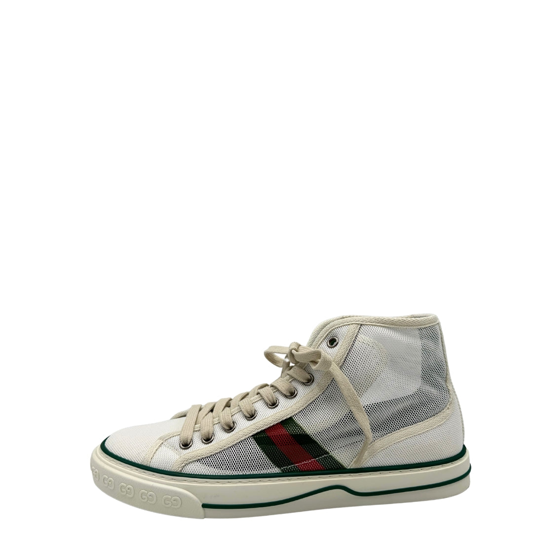Descrizione: Sneakers alte Gucci in tela traforata bianca, con classica banda Web verde e rossa sui lati, suola in gomma decorata con motivo GG in rilievo e dettagli in verde sul bordo. Complete di corredo.