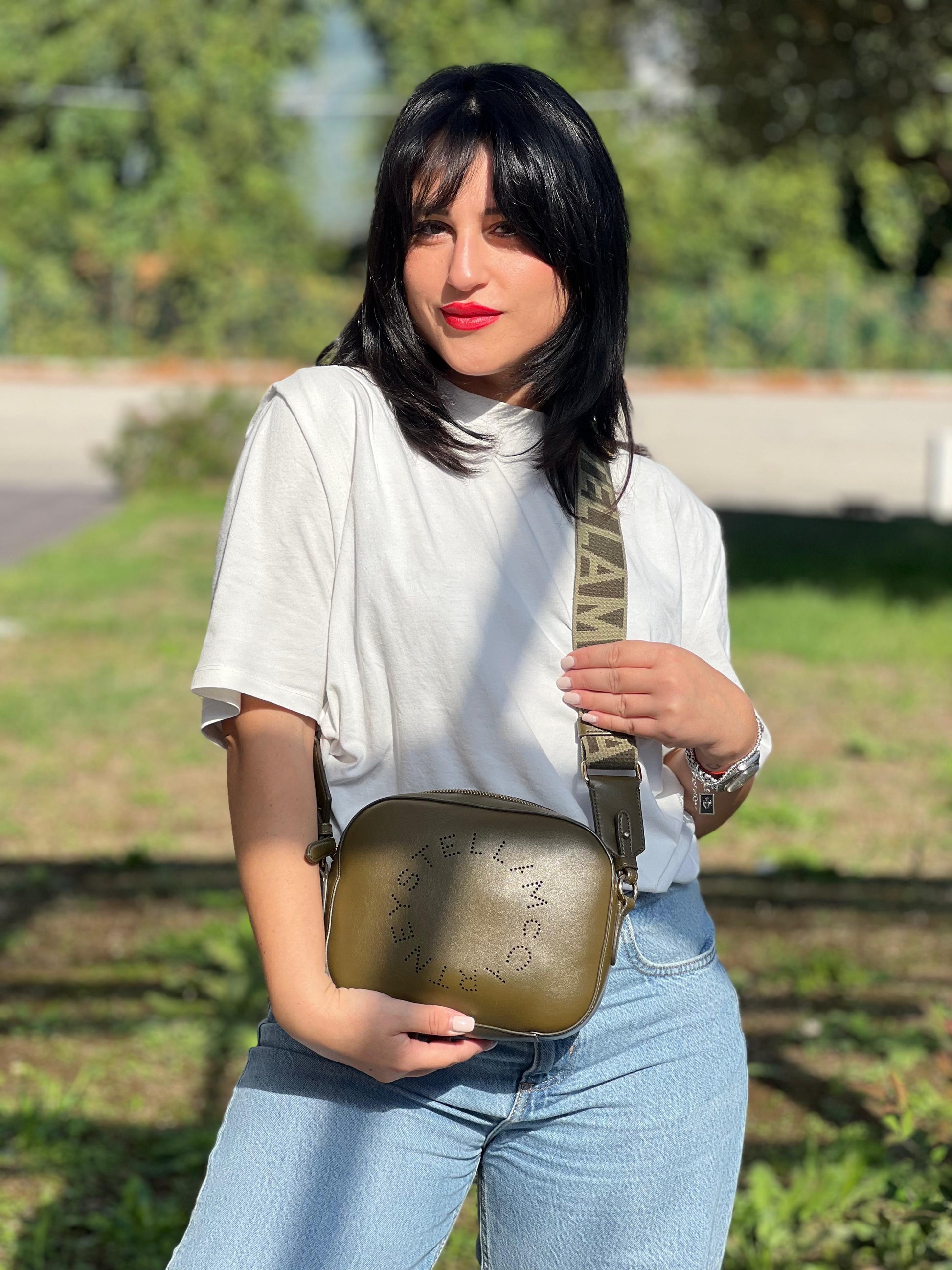 Descrizione: Borsa Stella McCartney in ecopelle verde militare con parti metalliche dorate e logo traforato sul front. Munita di una tracolla in tessuto regolabile. Completa di dustbag.