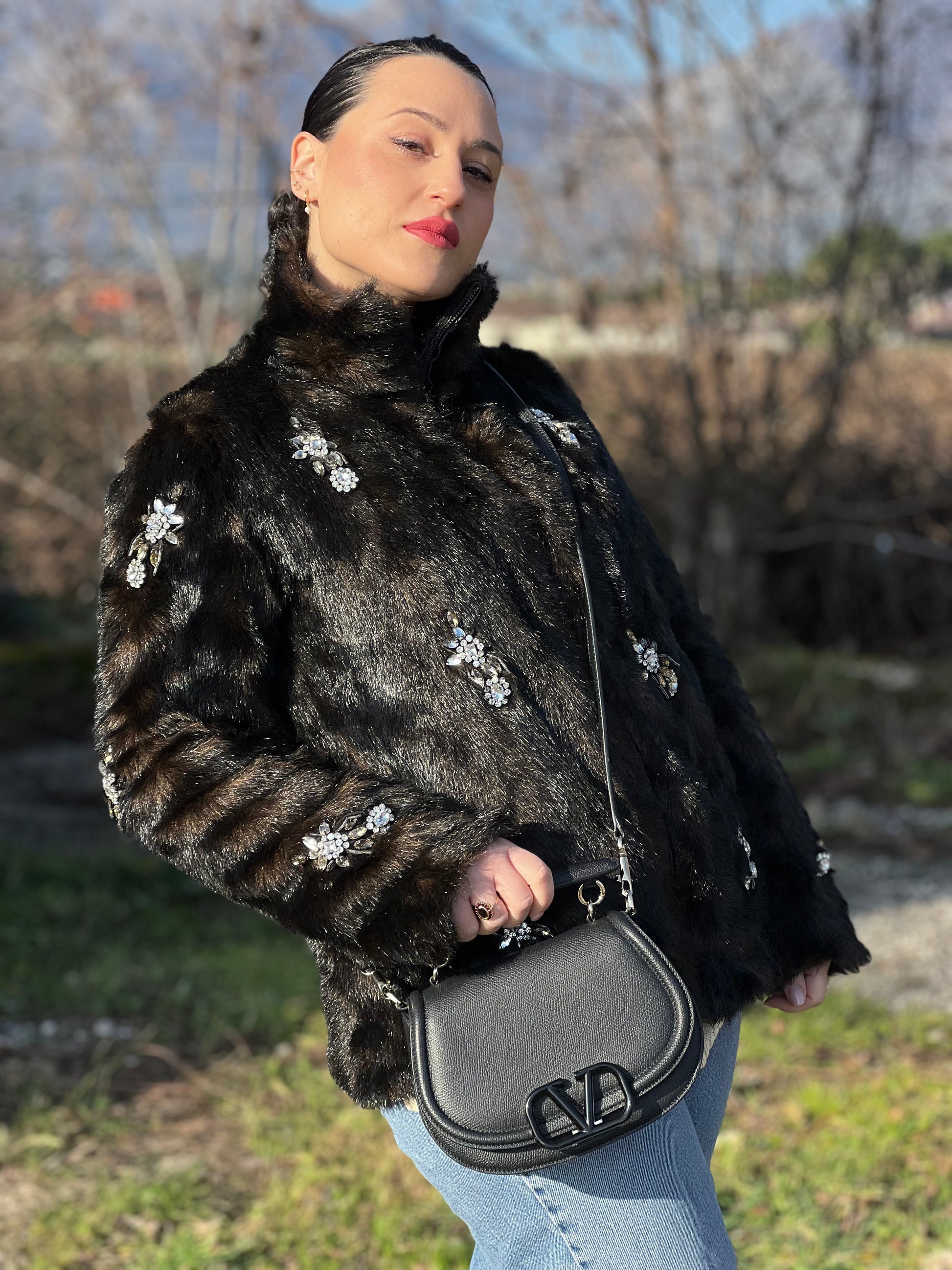 Descrizione: Borsa V. G. in pelle martellata nera con parti metalliche dorate e V logo nero; munita di un manico singolo e una tracolla in catena e pelle amovibile. Full set.